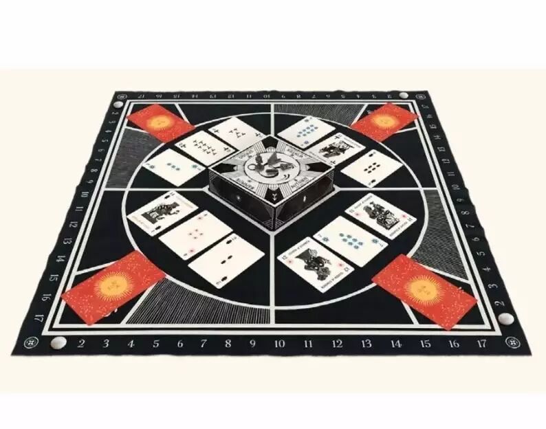 Le tapis en tissu, les cartes soignées, les jetons métalliques et le livret illustré contribuent à une expérience tactile et visuelle remarquable, invitant à une immersion totale dans cet univers raffiné.