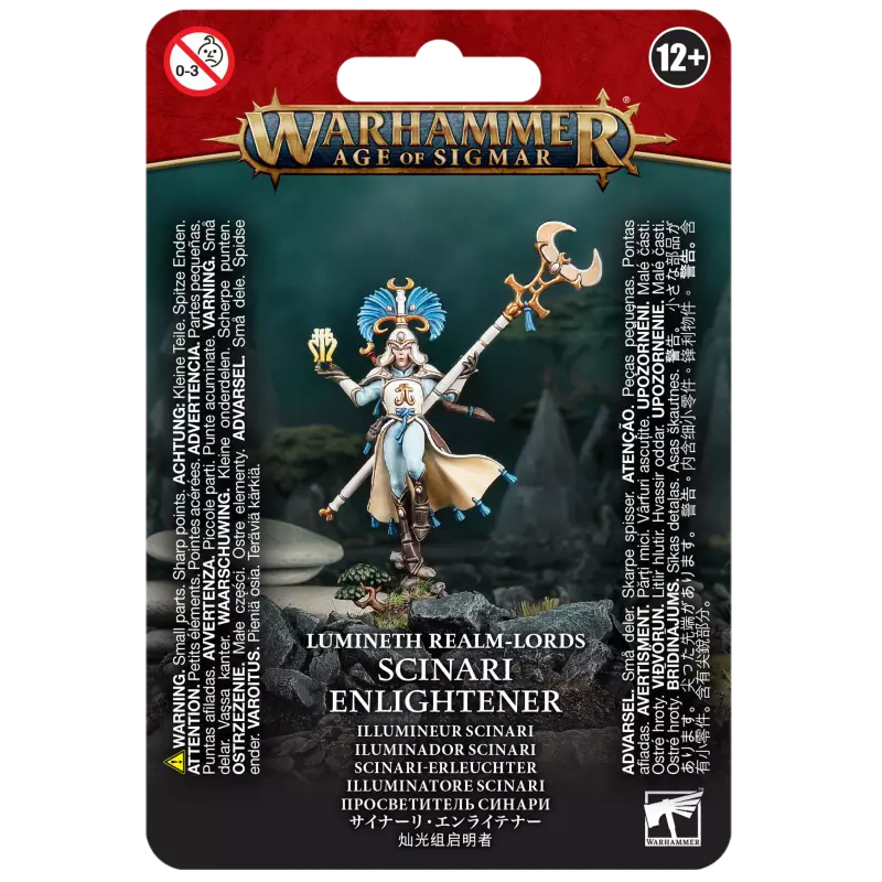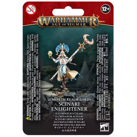 Ce kit plastique permet d'assembler un Illumineur Scinari, un talentueux maître de la sagesse mystique. Ce mage flotte au-dessus du sol, ses robes flottant derrière lui, tout en tenant la Rune d'Enthlai brûlante dans une main. Il manie un élégant bâton à tête en croissant capable d'incinérer les ennemis par des éclairs d'énergie, et il a une épée d'Illumineur accrochée dans le dos, prête à asséner un déluge de coups en combat rapproché. Le kit contient un choix de deux têtes, une avec un casque orné d'un impressionnant cimier, et une tête nue avec de longs cheveux tressés et un diadème délicat.