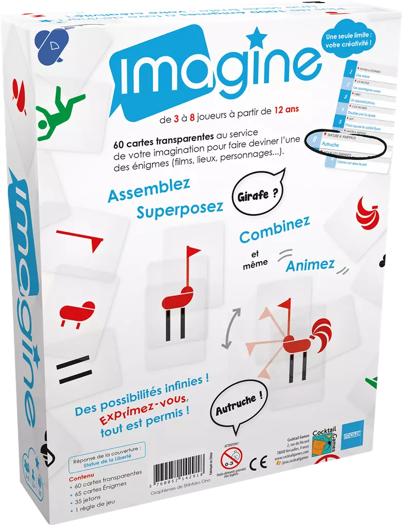 Imagine, c'est bien plus qu'un simple jeu de société, c'est une expérience ludique unique qui développe votre créativité et votre esprit d'équipe. Dans ce jeu de communication visuelle, vous allez devoir faire deviner des énigmes aux autres joueurs en utilisant uniquement des cartes transparentes illustrées.