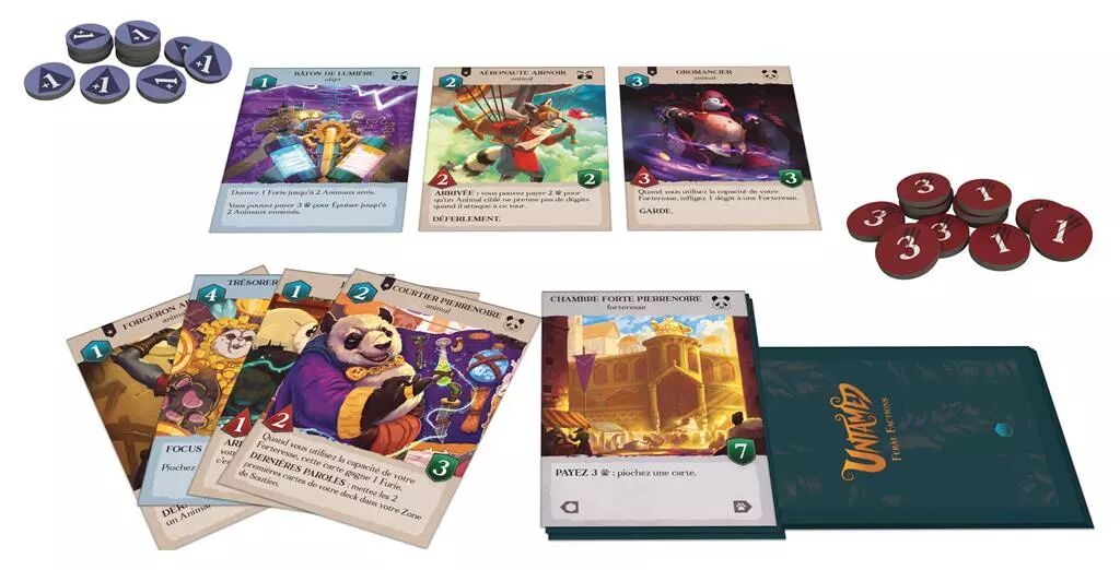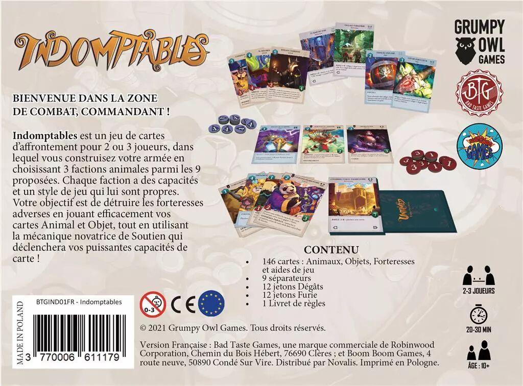 Indomptable est un jeu de duels de cartes rapide et survolté. Les joueurs prennent chacun le contrôle de trois factions animales qui combattent ensemble pour faire tomber les trois forteresses de l'adversaire. Chaque faction a sa propre identité visuelle, ses objets, ses animaux, sa forteresse et son style de jeu. En combinant trois factions différentes à chaque partie, les joueurs pourront découvrir de nouvelles synergies, combos et stratégies, ce qui donne au jeu une durée de vie phénoménale. Il existe deux ressources dans le jeu, la Puissance, qui sert à jouer de nouvelles cartes et à en piocher, et le Soutien qui permet d'activer des capacités. Toutes vos cartes Objet ou animal défaussées deviennent ensuite des soutiens supplémentaires, que l'on incline lors de leur utilisation. Si le jeu est prévu à la base pour deux joueurs, de nombreuses variantes sont proposées pour jouer à 3 et même à plus de 3 en utilisant deux boîtes ! Indomptable n'est pas un jeu à collectionner ! La boîte se suffit à elle-même et permet déjà plus d'une centaine de combinaisons de decks différents.