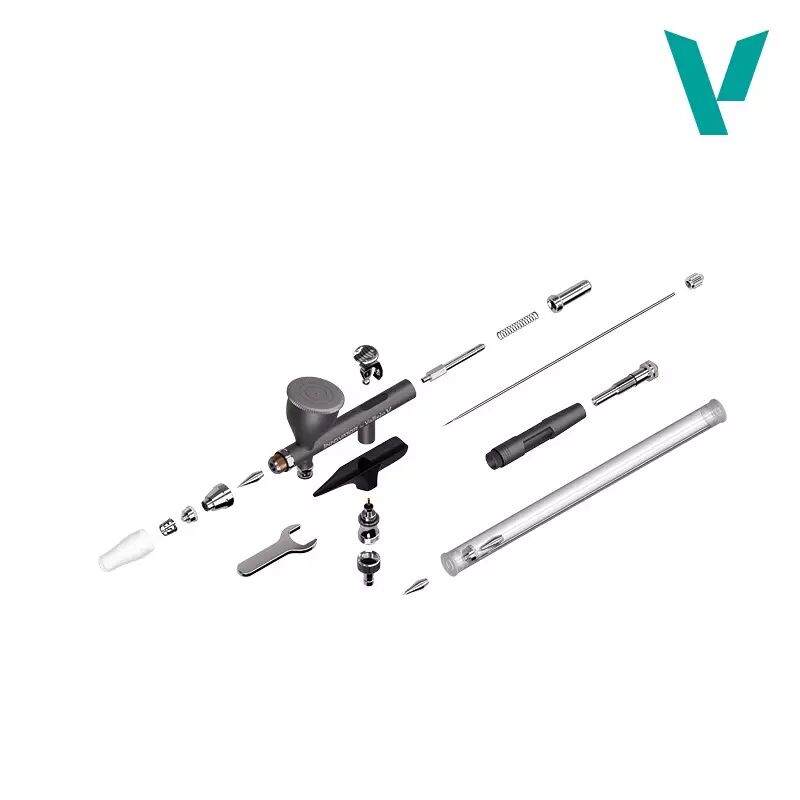 Conditionnement : Aérographe complète + 2 jeux d'aiguilles + coupe + connecteur + guide utilisateur.