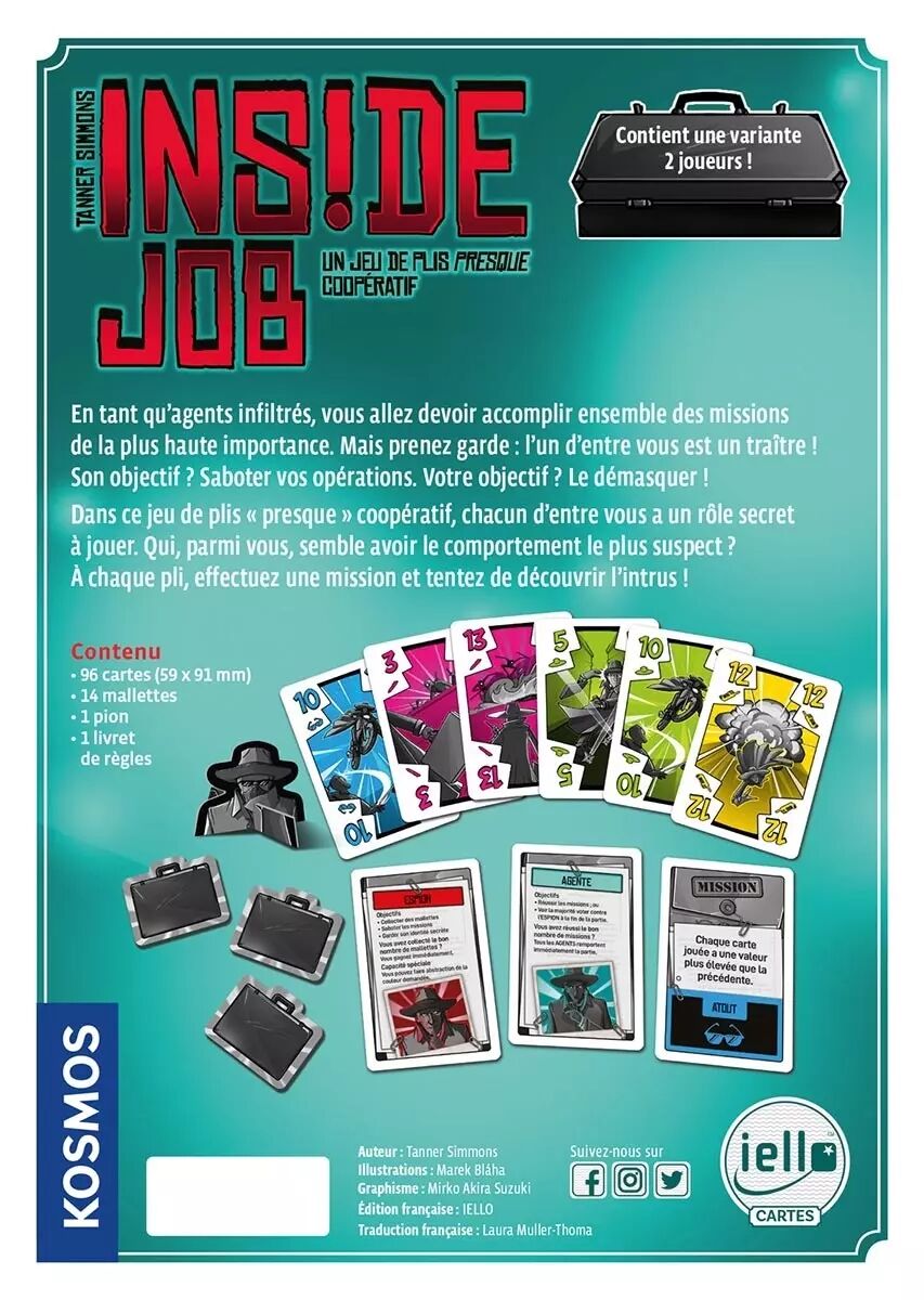 Inside Job est un jeu de plis à très haute tension, dans lequel les joueurs doivent réussir le pli demandé par la carte mission. Chaque carte mission, en effet, indique la manière dont elle doit être résolue et quel est l’atout de la manche en cours.