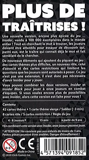 ne nouvelle version, encore plus épicée du jeu Insider, vendu à 100 000 exemplaires dans le monde ! Tout en cherchant le mot à trouver, les joueurs doivent être attentifs pour essayer de découvrir qui, parmi eux, est le traitre qui connait déjà le mot et fait semblant de le chercher.