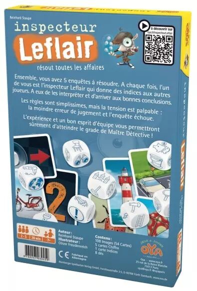 Le jeu se déroule en cinq manches, et vous commencez chaque manche en étalant cinq cartes images de la pioche. Si vous êtes l'inspecteur Leflair, mélangez les cartes chiffres (1-5) et regardez l'une d'entre elles pour déterminer quelle carte cible les joueurs ne doivent pas retirer du jeu. Vous lancez ensuite cinq dés image/symbole, choisissez l'un d'entre eux et le placez sur la carte indice. Les autres joueurs débattent alors et retirent une carte image du jeu. S'ils n'ont pas retiré la carte indice, vous ajoutez un dé image/symbole supplémentaire aux quatre restants, vous les lancez, choisissez un autre dé, et ainsi de suite.