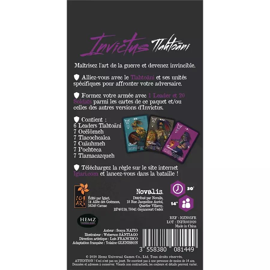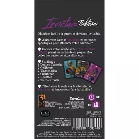 Chaque paquet est un stand-alone : un peuple avec ses propres unités, ses propres pouvoirs ... La première vague propose dans chaque display : 4 paquets Roi, 4 Tlahtoani et 4 Empereur. Dans chaque paquet, 41 cartes : 6 Leaders différents, 7 cartes de chacune des 5 unités différentes. À vous de constituer votre armée de 21 unités, 1 Leader et 20 Soldats.