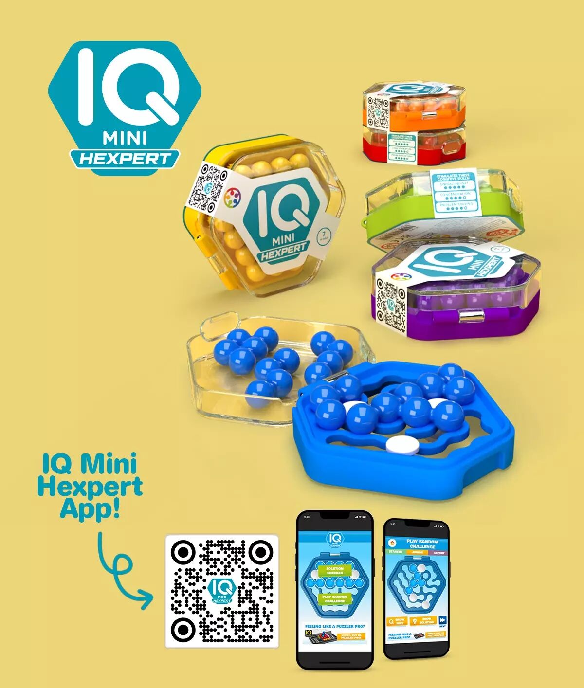 Prêt pour un IQ Mini plus exigeant ? Essayez IQ Mini Hexpert ! Un jeu de la gamme IQ qui tient dans votre poche et peut être emporté partout. Créez vos propres défis en déplaçant les bloqueurs puis remplissez le plateau hexagonal avec les six pièces du puzzle restantes. Choisissez votre couleur favorite et défiez vos amis ou votre famille en mode compétitif pour encore plus d'amusement ! Trouvez des défis supplémentaires, des indices et les solutions en ligne via le QR code ou notre site internet !