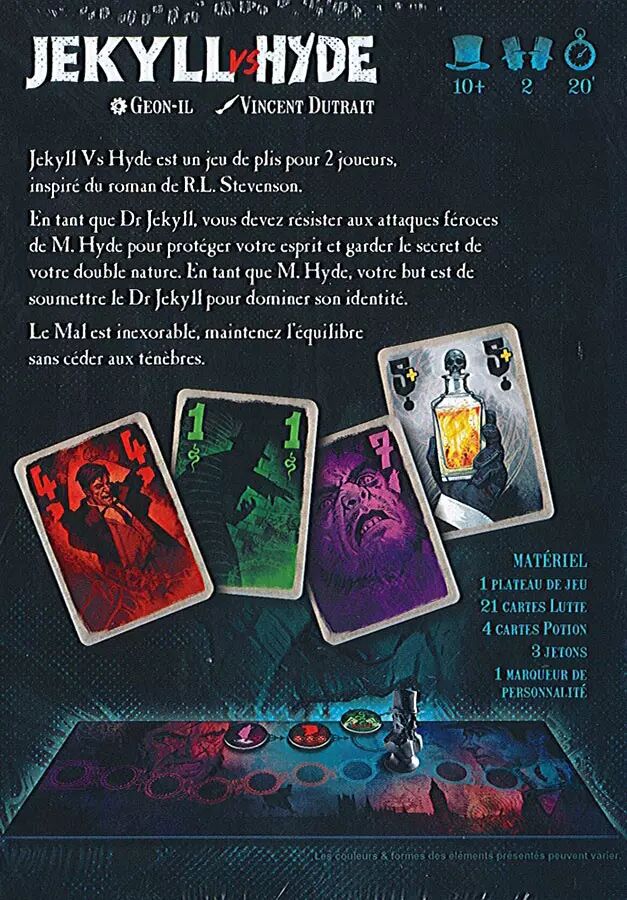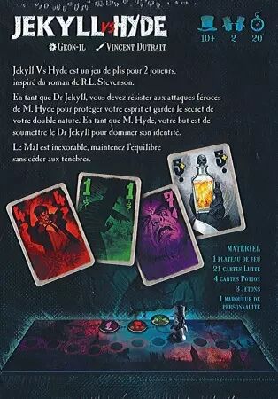 Réf. : MAN001JE Jekyll vs Hyde est un jeu de plis pour 2 joueurs inspiré, du roman L'Etrange Cas du docteur Jekyll et de M. Hyde de RL Stevenson. Chaque joueur incarne une facette de la personnalité du personnage principal. Le Dr Jekyll cherche à cacher sa double nature sans perdre la raison, tandis que Mr Hyde, son alter ego, cherche à le dominer et le faire basculer dans les ténèbres.