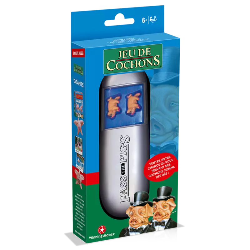 Le Jeu de Cochons est un jeu traditionnel où les joueurs se servent des cochons comme des dés ! Lancez les deux cochons autant de fois que vous l'osez pour marquer des points lorsque c'est votre tour. Mais si vous forcez la chance et que vous réalisez un "Cochon nul" ou un "Bon jambon", vous les perdrez tous.
