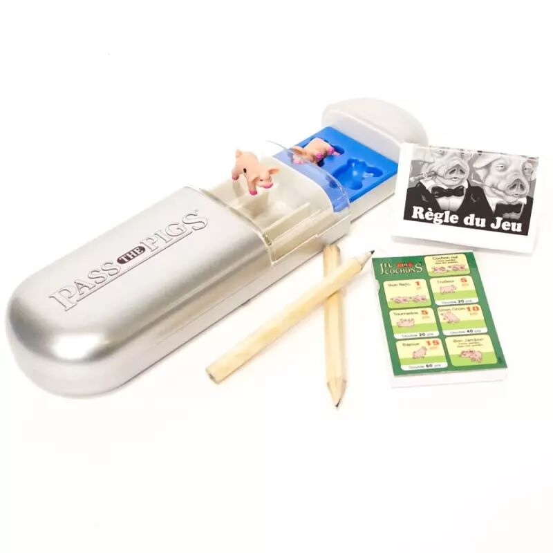 Contenu : 1 étui de rangement, 2 cochons, 1 bloc de score, 2 crayons, les règles du jeu.