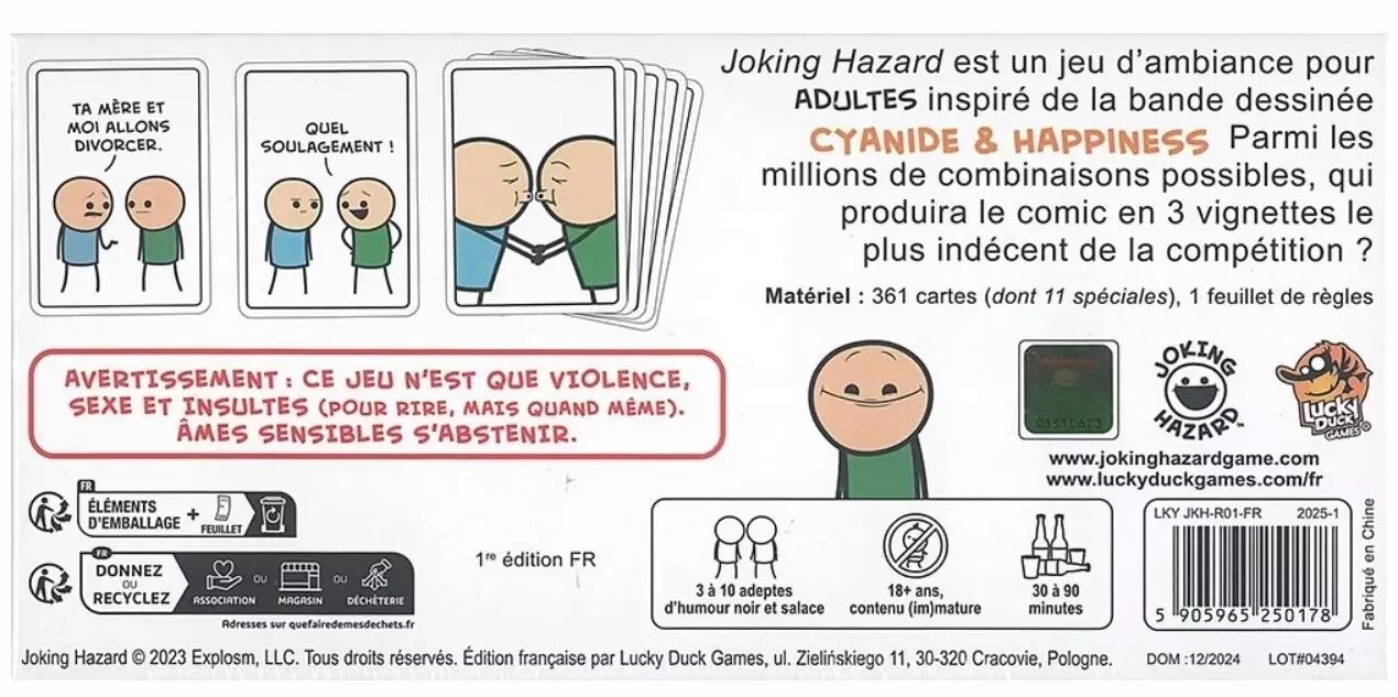 La boîte contient plus de 350 cartes illustrées, fidèles à l’univers graphique minimaliste et coloré de Cyanide & Happiness. Les cartes sont épaisses et agréables à manipuler, et la règle tient sur une simple feuille, rendant l’installation ultra rapide. Pas besoin d’être expert : il suffit de piocher, poser et rigoler. Le format compact permet d’emmener Joking Hazard partout, pour improviser une partie à tout moment