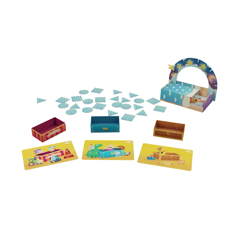 Pour cela, révèle un jeton jouet et observe-le attentivement. Range-le dans le coffre correspondant ou place-le dans ton lit douillet s’il n’apparaît sur aucune illustration de coffre. Attention à ne pas révéler trop d’étoiles, car elles te rapprochent de la tombée de la nuit et de la fin de la partie.