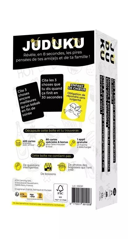 Juduku : Le classique des jeux de soirée ! 480 cartes délirantes pour animer vos soirées et révèler les pires secrets de vos amis. Le joueur au QI le plus faible est désigné «Maître du Juduku». Il pioche la première carte et pose la question à un joueur qui a 8 secondes pour y répondre. Si les réponses sont acceptées par le Maître du Juduku alors le joueur qui a répondu marque 1 point. Le gagnant devient à son tour le Maître du Juduku. C’est à lui de poser une question au joueur suivant. Le premier joueur qui atteint le score de 7 points est déclaré vainqueur.