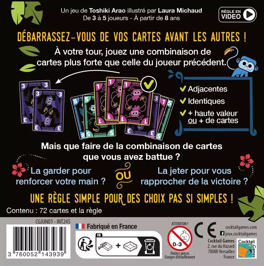 Fidèle à la réputation de Cocktail Games, Jungo séduit par son esthétique soignée. Les illustrations de Laura Michaud apportent une touche de charme et d'originalité au jeu. Le format compact et la qualité des cartes en font un compagnon idéal pour vos soirées jeux ou vos voyages. Jungo allie parfaitement fonctionnalité et attrait visuel, promettant des parties aussi agréables à l'œil qu'à jouer.