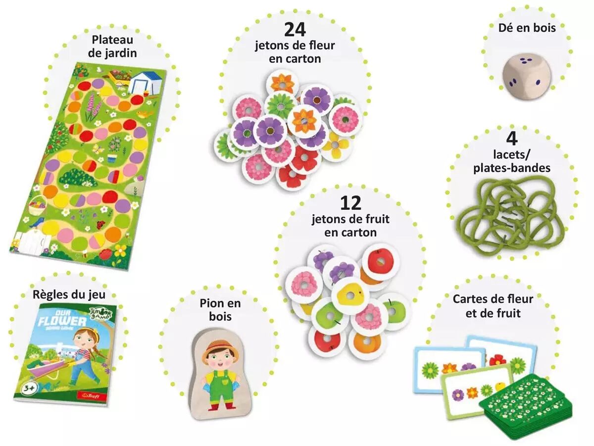 Our Flower fait partie de la gamme "Junior Game", spécialement conçue pour les enfants de 3 à 4 ans. Les règles sont adaptées à leur âge et le matériel est conçu pour être facile à manipuler. Les illustrations colorées et les thèmes variés stimulent leur imagination et leur curiosité.