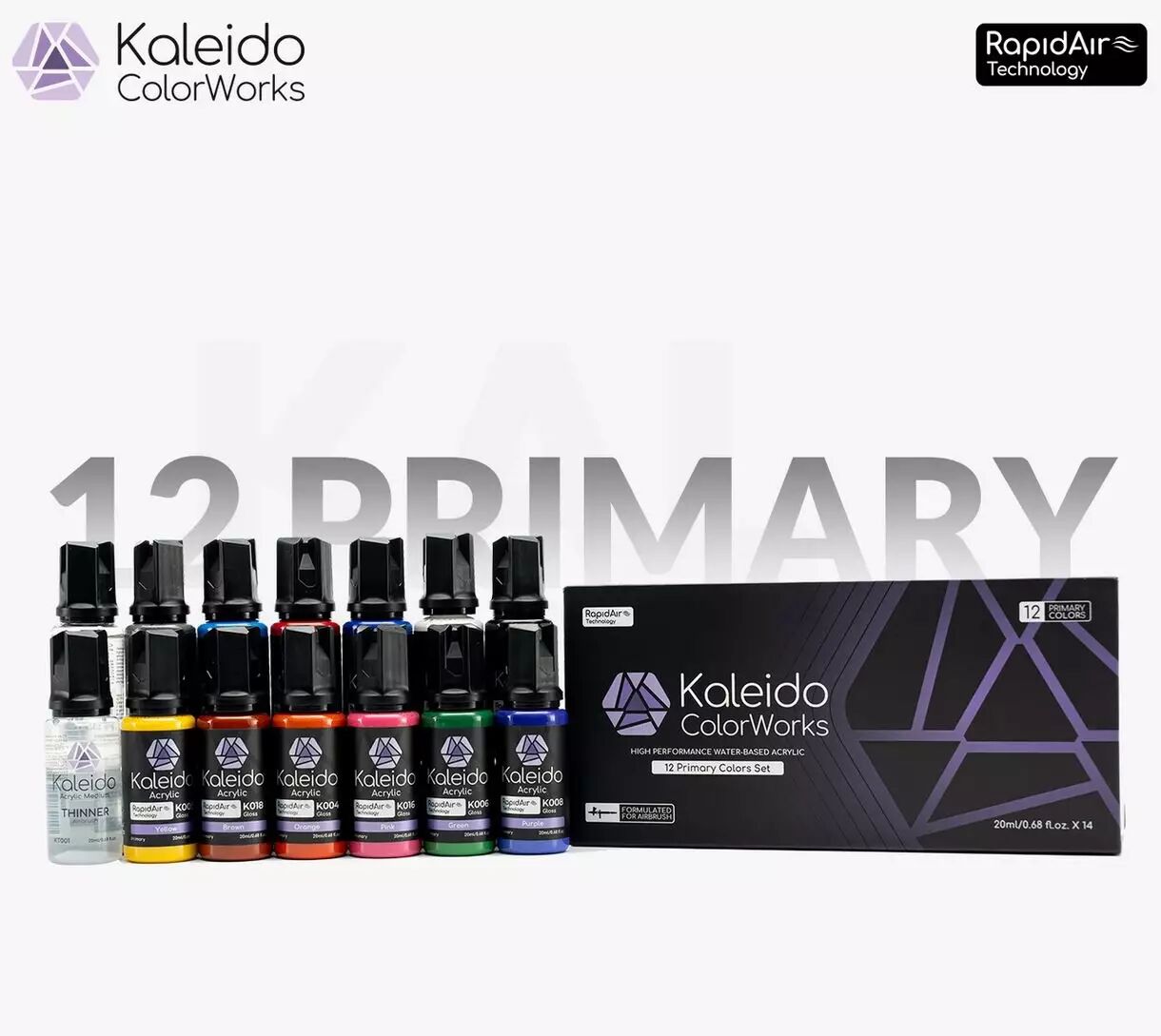 Le set 12 Color Primary de Kaleido est le point d'équilibre parfait entre compacité et performance. Chaque teinte est formulée avec des pigments micronisés, ce qui évite l'accumulation de matière en bout de buse, un problème fréquent avec les peintures acryliques classiques.