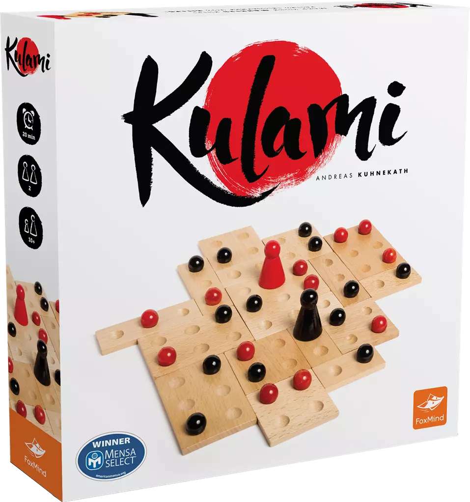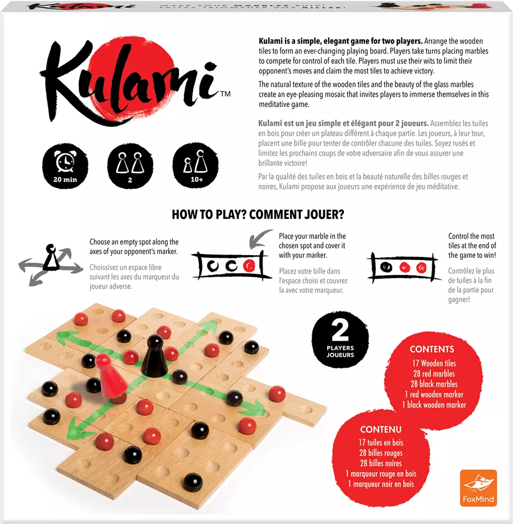 Kulami est un jeu simple et élégant pour 2 joueurs. Assemblez les tuiles en bois pour créer un plateau différent à chaque partie. Les joueurs, à leur tour, placent une bille pour tenter de contrôler chacune des tuiles. Soyez rusés et limitez les prochains coups de votre adversaire afin de vous assurer une brillante victoire. Par la qualité des tuiles en bois et la beauté naturelle des billes rouges et noires, Kulami propose aux joueurs une expérience de jeu méditative et stratégique !