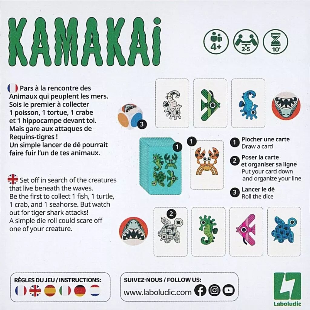 Kamakai est un jeu de cartes dans lequel les joueurs s'affrontent pour collectionner les animaux marins les plus rares. Pour cela, ils piochent des cartes représentant des poissons, tortues, crabes ou hippocampes de différentes couleurs, et les ajoutent à leur ligne personnelle. Le premier joueur à réunir un exemplaire de chaque animal dans sa ligne remporte la partie.