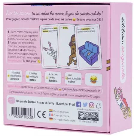 Réf. : ATAMARKAN kantoutacou est le jeu d'apéro qui va vous faire raconter des histoires cul-tes ! Lisez les cartes telles quelles ou osez les modifier pour encore plus de WTF !