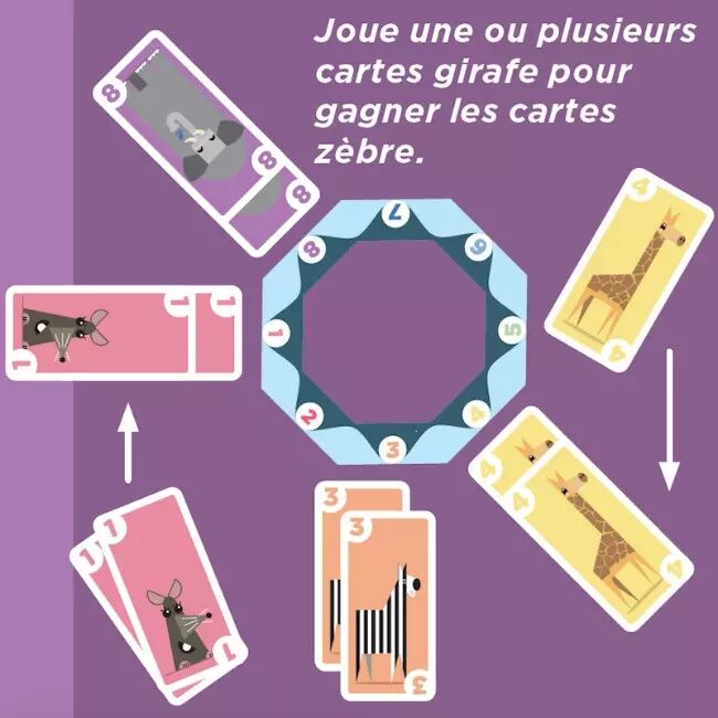 Le monde impitoyable de la savane !! Règle : Kariba est un jeu de cartes malin. Au cœur de la savane, les animaux viennent s'abreuver au bord du lac, mais la loi du plus fort domine ! Ton but sera de gagner le plus de cartes possible. À ton tour, joue la carte Animal qui chassera les autres au risque de te faire chasser à ton tour. Dans ce jeu, l'éléphant est roi... sauf quand la souris passe par là. Il faut minimum 3 cartes d'un même animal pour faire fuir le premier animal plus petit présent autour de l'eau. Si 3 cartes sont déjà présentes, il suffit d'en ajouter 1 pour gagner les cartes plus petites ! Contenu : 64 cartes Animal, une marre de jeu en puzzle, 1 règle de jeu