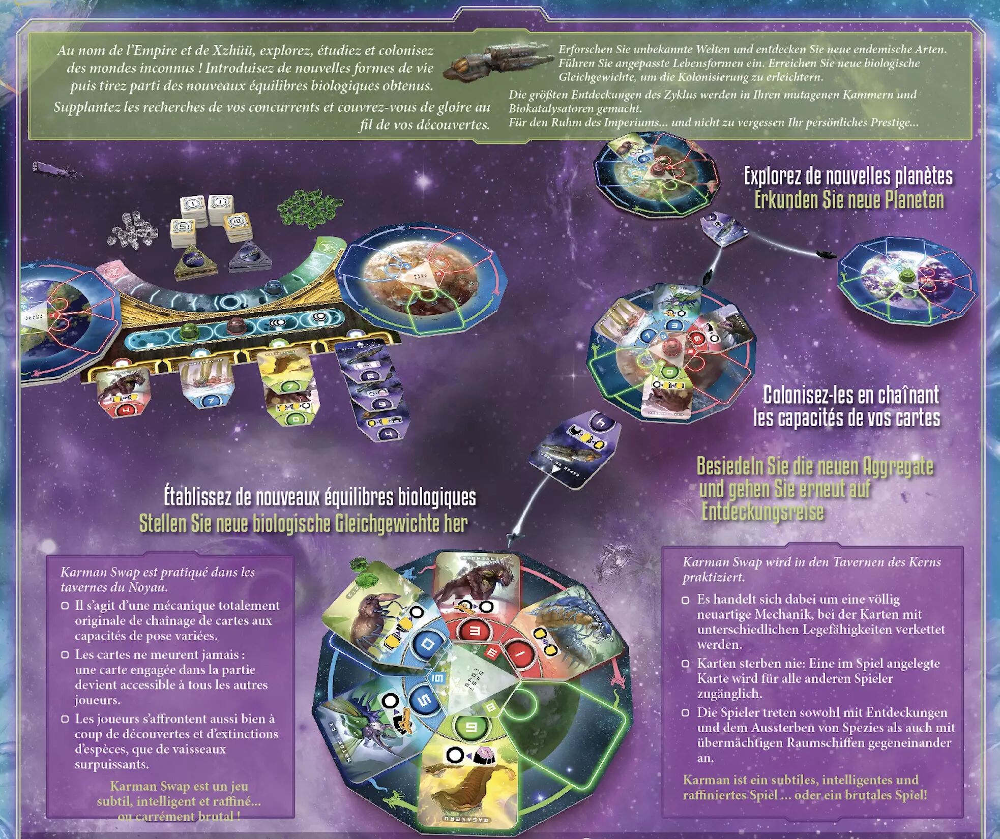 Explorez des planètes et introduisez des espèces, pour atteindre l’équilibre biologique. Augmentez vos connaissances scientifiques pour tenter des colonisations sur d’autres planètes et choisissez bien vos cartes pour provoquer des réactions en chaîne.