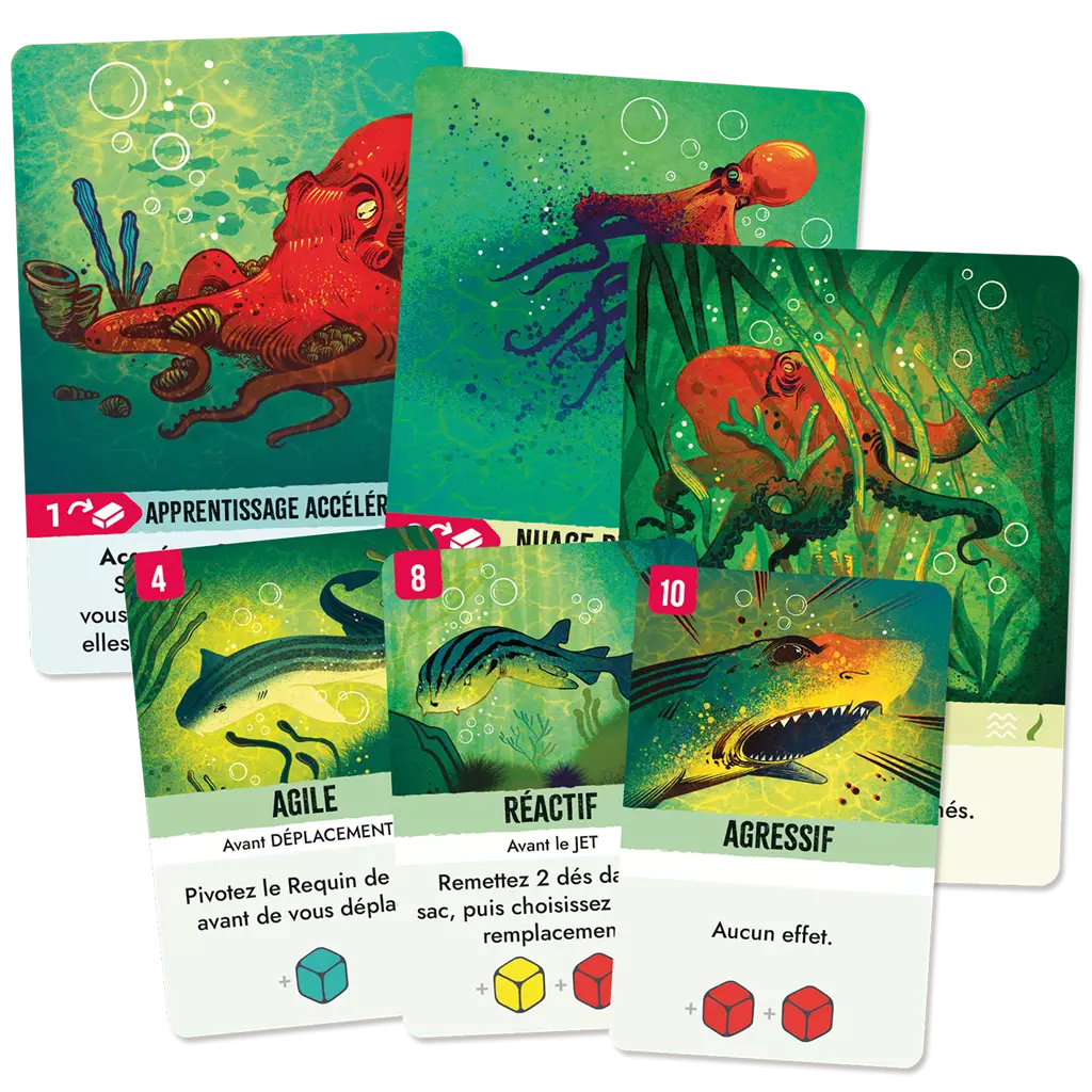Vous incarnez la Pieuvre ou le Requin. La première naviguera habilement sur le plateau, jouera des cartes et effectuera des manœuvres discrètes, élaborant ainsi des stratégies destinées à survivre jusqu’à la fin de la partie. Le Requin patrouillera sur son territoire en lançant des dés pour déclencher des capacités uniques et traquer l’insaisissable Pieuvre. Quel que soit votre rôle, préparez-vous à vivre une aventure exaltante !