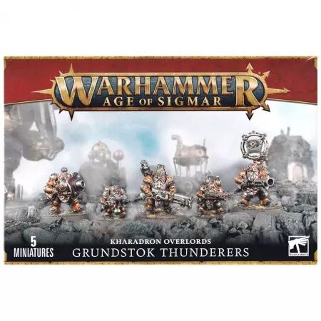 Ce kit plastique contient les pièces nécessaires pour assembler 5 Foudroyeurs Grundstok, des soldats de métier qui forment la principale force armée des Magnats Kharadrons. Chacun est doté d'un fusil à munitions éthériques, avec en option des armes spéciales singulièrement massives - un fumigateur éthérique, un mortier Grundstok (avec une bombe en plus pour décorer le socle), un éthercanon (si puissant que son servant duardin porte un bouclier déflecteur) et l'arme à cinq tubes baptisée balayeuse. Leurs scaphandres blindés sont bardés de conduits, de valves et d'un circuit respiratoire pour conditionner l'air à leurs poumons accoutumés à l'éther-or.