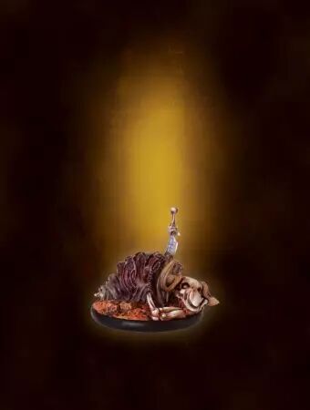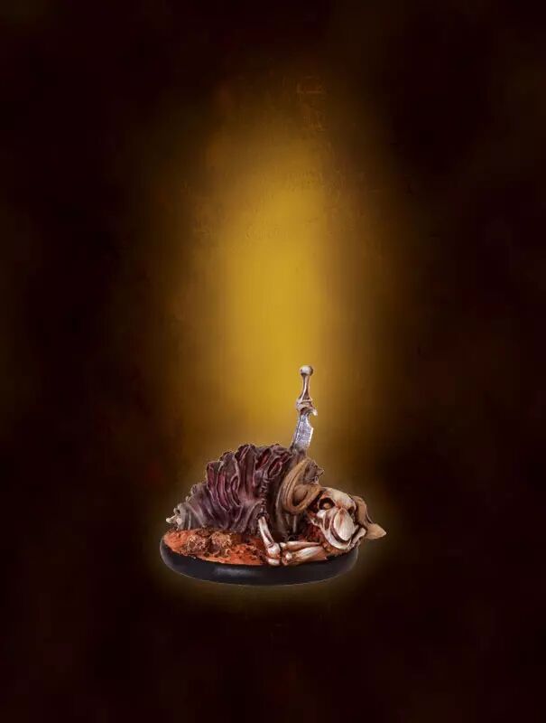 Des règles spéciales existent pour Dévorer ou Dépouiller les carcasses en jeu. Vous pouvez aussi les utiliser comme élément de décor. Cette première version en 40 mm représente un Goûn mais il est utilisable pour représenter le cadavre de toutes les figurines qui possèdent cette taille de socle.