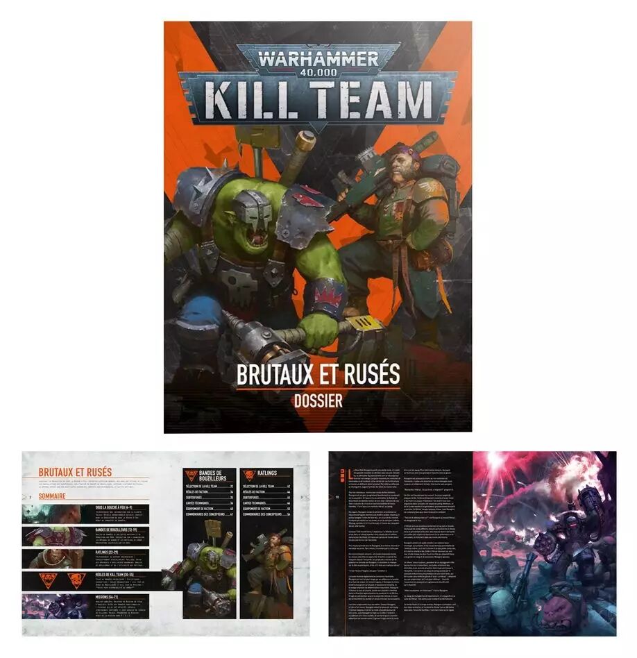 – 1x Dossier Brutaux et Rusés à reliure souple de 72 pages: Il contient tout l'historique, les illustrations et les règles pour les deux kill teams de la boîte, ainsi qu'un aperçu de la planète Volkus, de la Désolation de sous la Bouche à Feu qui entoure la Ruche Fissilicus et des kill teams qui s'affrontent au milieu de ses ruines effondrées et de ses fortifications.