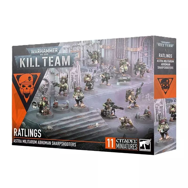 Ce kit en plastique permet d'assembler une escouade de 10 Ratlings, accompagnés d'un Cabot, d'un marqueur de Cache de Munitions et de deux marqueurs de Fil-piège. Ces figurines peuvent être utilisées en tant qu'agents dans les parties de Kill Team ou être incorporées au sein des armées de l'Astra Militarum dans les parties de Warhammer 40,000. Le kit contient nombre d'options et d'éléments interchangeables, des accessoires pour personnaliser votre kill team, ainsi que des éléments pour assembler des spécialistes, comme le Rustaud endurci, le discret Pied-pelu, le Fourrier aux doigts d'or, et plus encore.