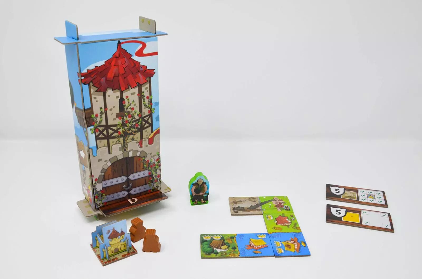 Age of Giants intègre dans sa boîte une tour en 3D qui permet non seulement de ranger toutes les tuiles du jeu mais également de faciliter la distribution des dominos lors des différents tours.