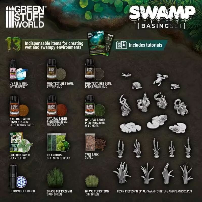 Les différentes décorations UV d'eau, de végétation, de mousse et d'autres animaux des marais incluses dans ce set vous permettront de personnaliser votre maquette ou votre diorama, en donnant une touche de réalisme et d'originalité à la scène. Parfait pour les débutants comme pour les amateurs, ce matériel de modélisme et de wargame vous aidera à donner vie à vos idées.