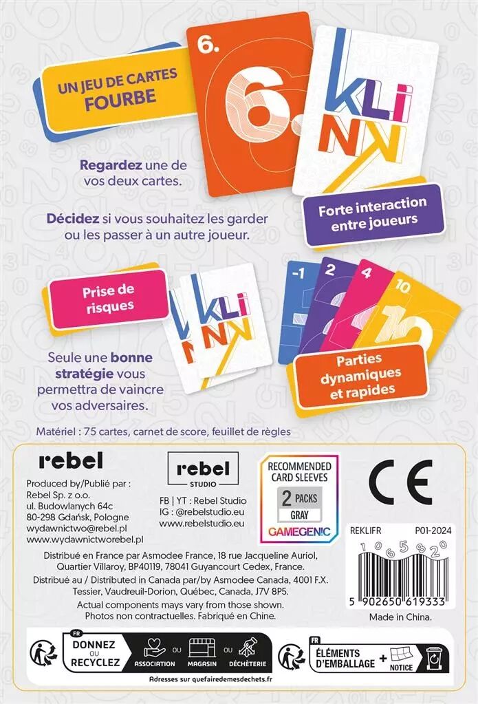 Votre objectif dans Klink est de cumuler le moins de points possible en formant des paires et des trios de cartes. Mais n'oubliez pas que les cartes "action" peuvent vous donner un avantage décisif pour semer la zizanie parmi vos adversaires et les empêcher d'atteindre leurs objectifs. La partie se termine lorsqu'un joueur a dix cartes devant lui, et le décompte des points commence. Préparez-vous à des retournements de situation spectaculaires, car les points peuvent s'inverser en un clin d'œil !