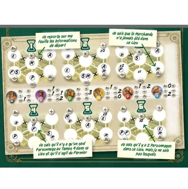 Récupérez des indices en utilisant les plaques Temps et Personnage pour comprendre les déplacements des suspects de l’intrigue dans les différents Lieux. Attention, certaines routes peuvent être à sens unique ou barrées en fonction des enquêtes. Vous recevez une information privée, ainsi qu’une seconde que vous devez partager avec les autres. Prenez des notes sur votre feuille et déduisez les réponses à l’enquête en cours.