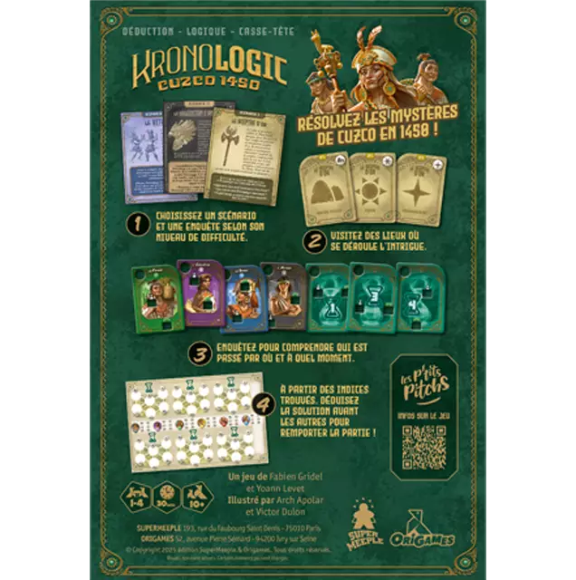 Avec 15 enquêtes aux scénarios et niveaux de difficulté variés, Kronologic Cuzco 1450 promet de nombreuses heures de jeu sans lassitude. Les changements de plateau et la diversité des situations assurent une forte rejouabilité. Le jeu inclut tout le nécessaire : 6 plaquettes Personnage, 6 plaquettes Temps, plateau, bloc de feuilles, paravents, livrets scénarios, 90 cartes, règle, crayons et jetons – tout est prêt pour partir à l’aventure dès l’ouverture de la boîte.