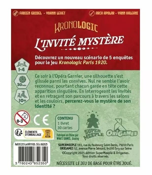 Cette extension renforce la dynamique de Kronologic Paris 1920 avec des éléments permettant de construire une chronologie précise et de confronter les versions des joueurs. Chaque action a un poids et invite à la réflexion collective dans un esprit coopératif intense.