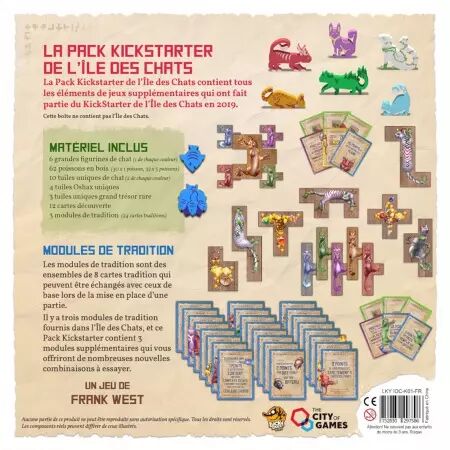 Le Pack Kickstarter est une extension qui contient tous les éléments de jeux supplémentaires qui ont fait partie du Kickstarter de l'Ile des Chats en 2019. Ce Pack contient aussi plusieurs modules de cartes Tradition qui vous offriront de nombeuses nouvelles combinaisons à essayer !
