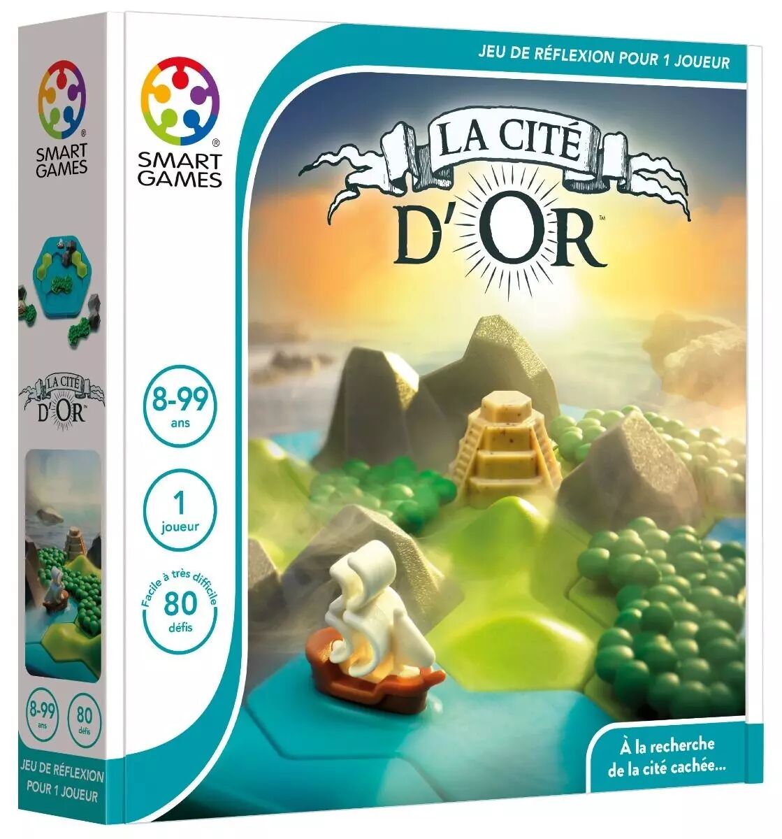 En explorant le nouveau continent trouvez l’unique emplacement de la tuile avec la pyramide. À l’aide des indices donnés par la carte sur la nature des régions sauvages à franchir, saurez-vous assembler les différents types de terrains en manipulant les quatre tuiles articulables afin d’atteindre la mythique Cité d’Or ? Ce jeu de réflexion propose quatre-vingts défis évolutifs du plus simple au plus difficile pour toute la famille.