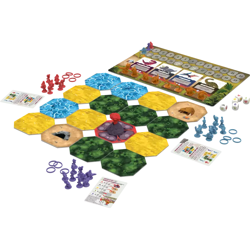 Pas juste de la couleur locale : chaque dinosaure vient avec un pouvoir spécifique qui transforme votre stratégie. Le Tyrannosaure dévore les Cro-Magnons adverses quand il se déplace, le Tricératops annule simplement la présence des rivaux sur sa tuile, le Brontosaure compte comme plusieurs figurines pour les majorités, le Stégosaure te laisse provoquer des séismes sans besoin de contrôler le volcan. Tu dois donc pas juste penser au contrôle de territoire : tu réfléchis aussi sur quels dinosaures tu recrutes et comment tu les utilises. C'est une asymétrie bien pensée.