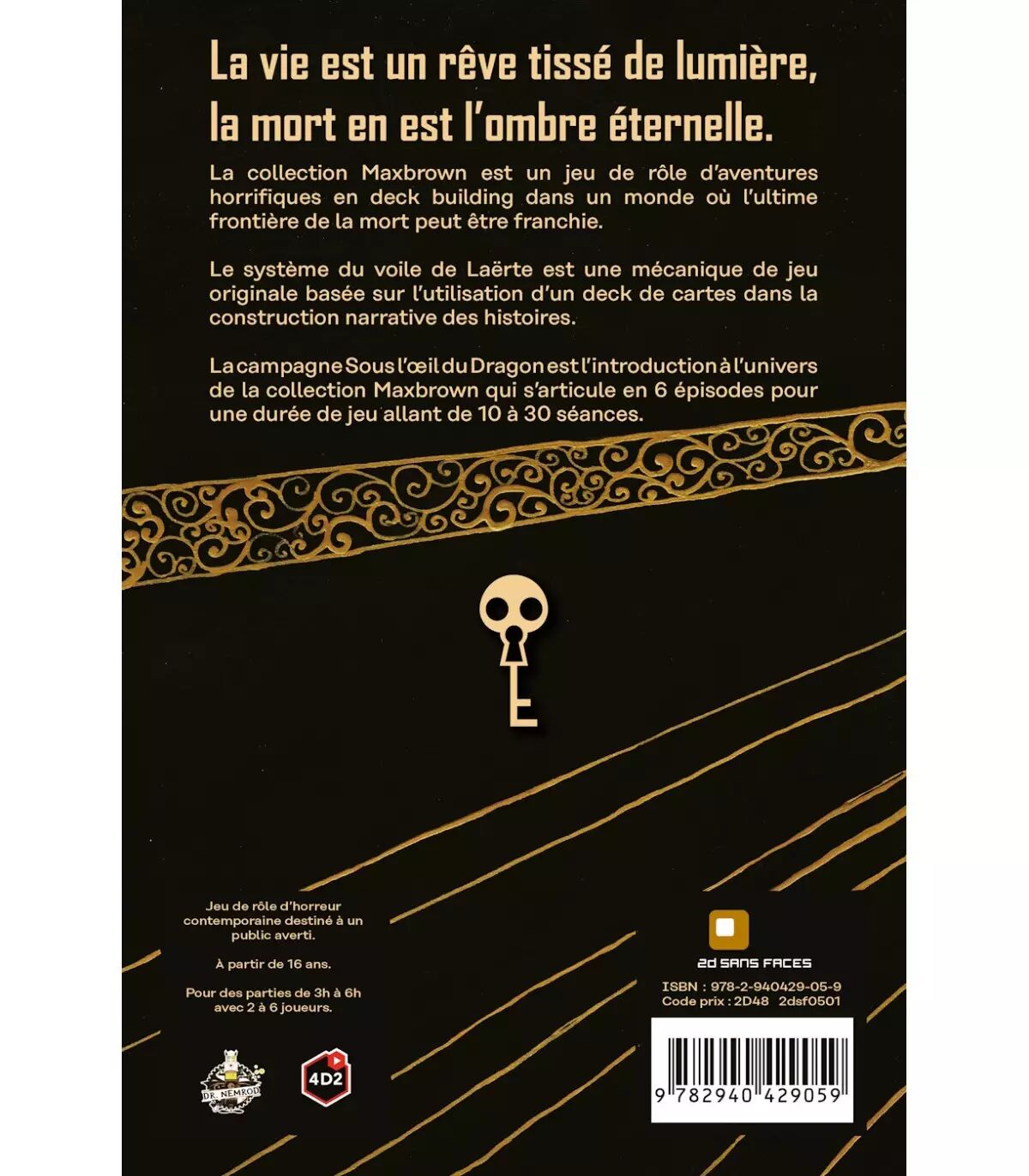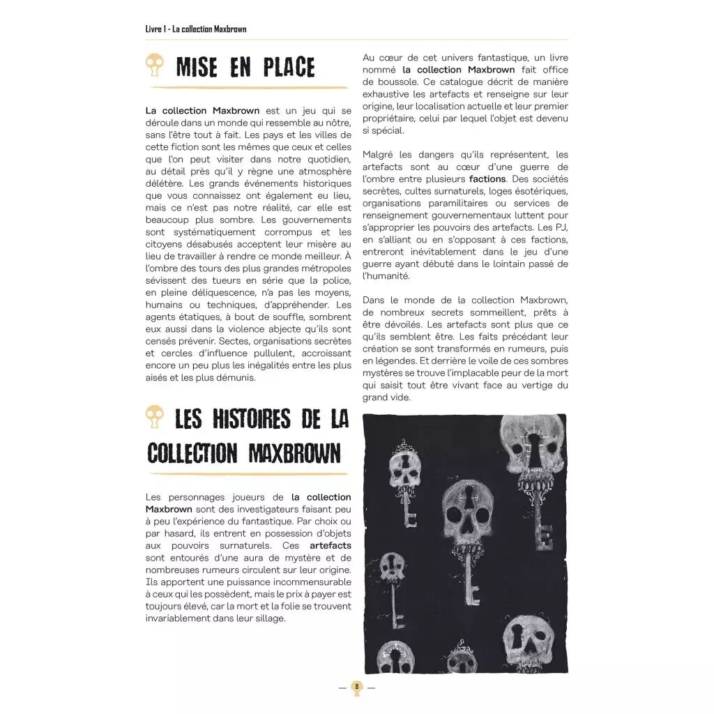 La collection Maxbrown est un jeu de rôle d’aventures horrifiques en deck building plaçant la mort au centre des histoires. Les joueurs et joueuses incarnent des personnages de notre époque initiés à un monde où des forces surnaturelles se battent dans l’ombre pour le plus grand des prix : vaincre la mort et vivre éternellement.