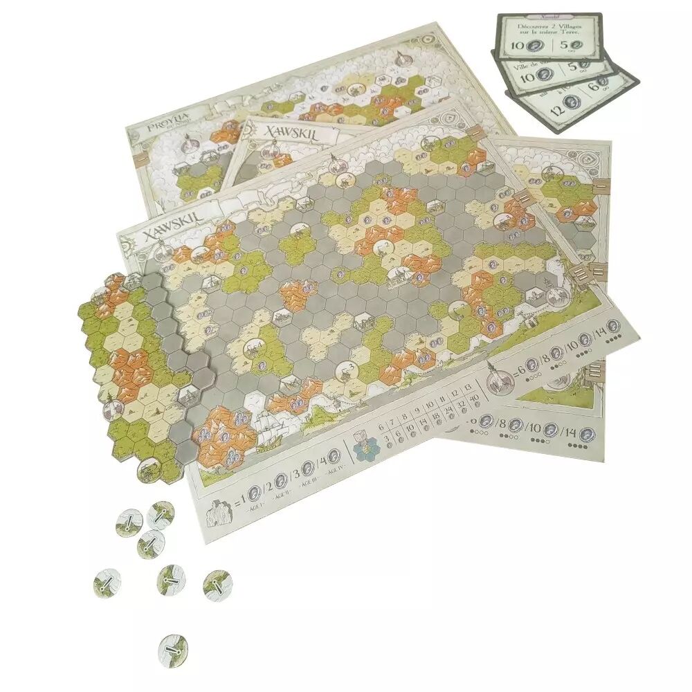 Dans La Guilde des Expéditions Marchandes, le but de chaque joueur est d’amasser des Pièces en explorant sa Mappe en fonction des Cartes Exploration révélées. Vous pouvez explorer les Cases adjacentes à votre Capitale, aux précédents Cubes Explorateur que vous avez posés, ou aux Villages que vous découvrirez. À la fin de chacun des 4 Âges, tous les cubes sont retirés, ne laissant derrière eux que les villages comme nouveaux points de départ. À vous de rentabiliser au mieux vos expéditions.
