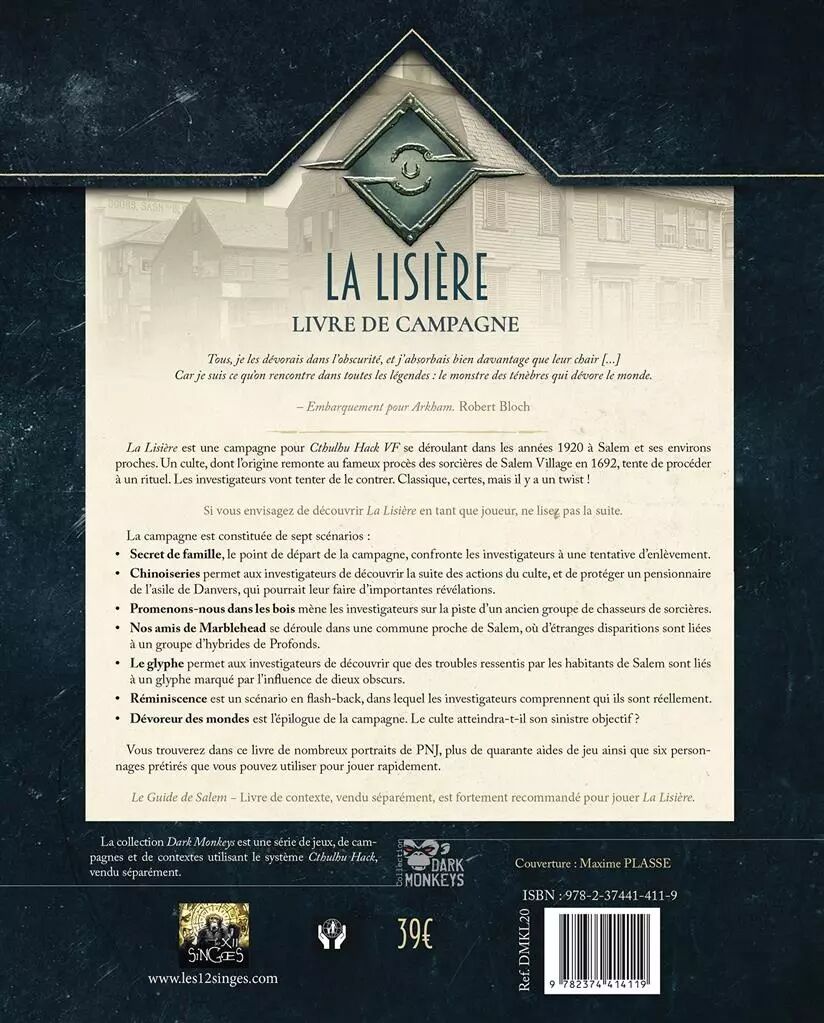 La Lisière est une campagne et un contexte de jeu se déroulant dans les années 20 à Salem et dans ses environs. Il se compose de trois éléments. La campagne se compose de 7 scénarios se déroulant autour d’un rituel remontant au XVIIe siècle. Le guide de Salem est indispensable à la campagne, mais peut être utilisé pour tout autre jeu, car il ne contient pas de termes techniques. Le pack contient un écran 3 volets, des aides de jeu, un trombinoscope, deux plans, etc.