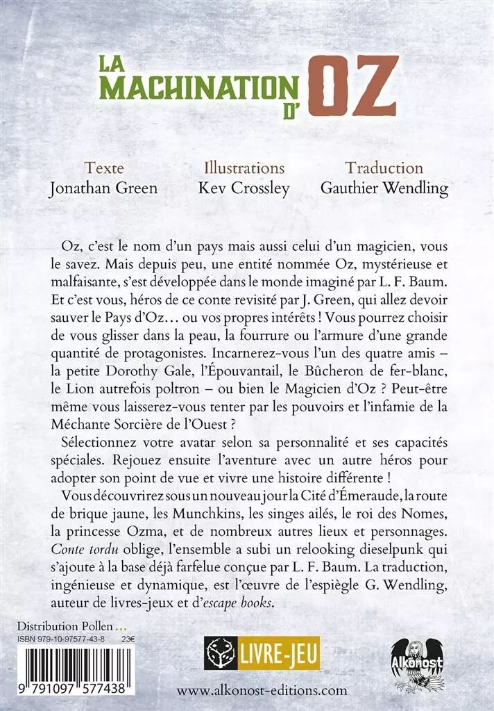 Oz, c’est le nom d’un pays mais aussi celui d’un magicien, vous le savez. Mais depuis peu, une entité nommée Oz, mystérieuse et malfaisante, s’est développée dans le monde imaginé par L. F. Baum. Et c’est vous, héros de ce conte revisité par J. Green, qui allez devoir sauver le Pays d’Oz… ou vos propres intérêts ! Vous pourrez choisir de vous glisser dans la peau, la fourrure ou l’armure d’une grande quantité de protagonistes. Incarnerez-vous l’un des quatre amis – la petite Dorothy Gale, l’Épouvantail, le Bûcheron de fer-blanc, le Lion autrefois poltron – ou bien le Magicien d’Oz ? Peut-être même vous laisserez-vous tenter par les pouvoirs et l’infamie de la Méchante Sorcière de l’Ouest ?