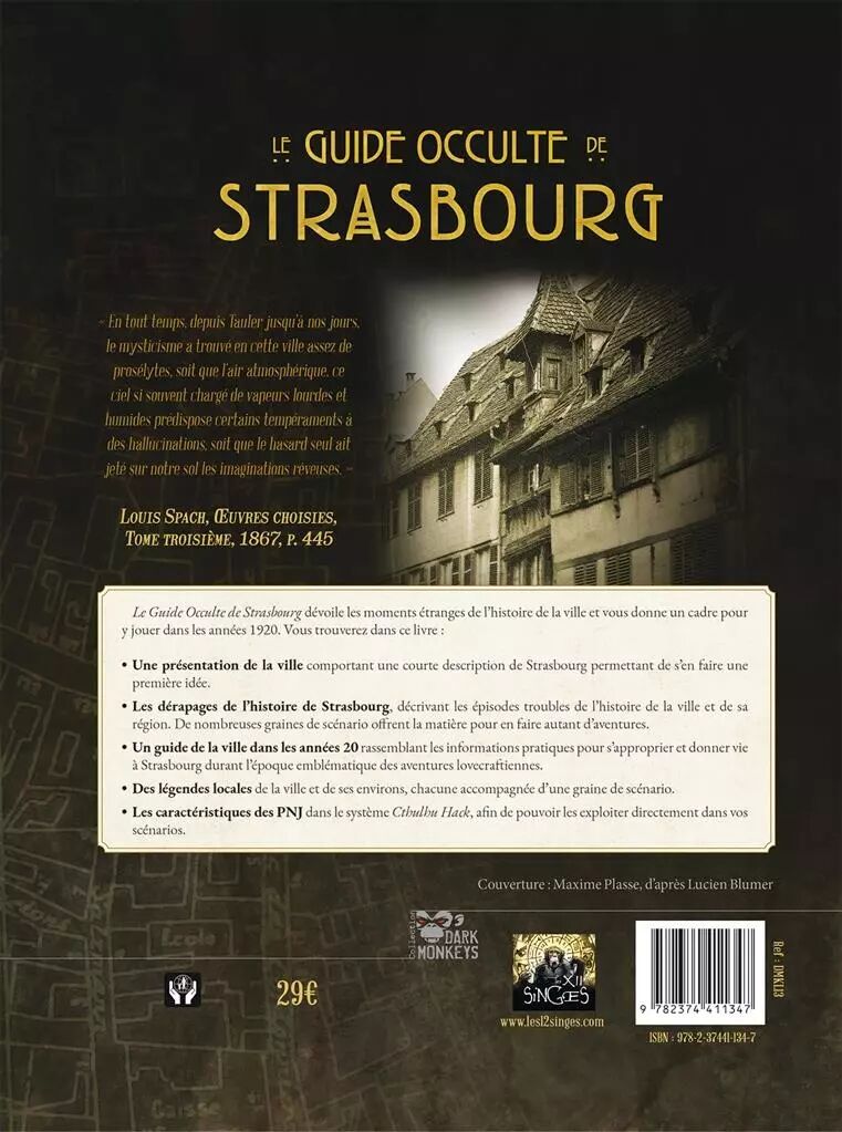 De nombreuses graines de scénarios offrent la matière pour en faire autant d’aventures ; un guide de la ville dans les années 20 rassemblant les informations pratiques pour s’approprier et donner vie à Strasbourg durant l’époque emblématique des aventures lovecraftiennes ; des légendes locales de la ville et de ses environs, chacune accompagnée d’une graine de scénario ; les caractéristiques des PNJ dans le système Cthulhu Hack, afin de pouvoir les exploiter directement dans vos scénarios. C’est un supplément de 124 pages en couleur, couverture rigide.