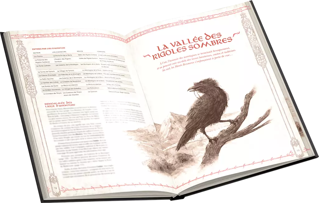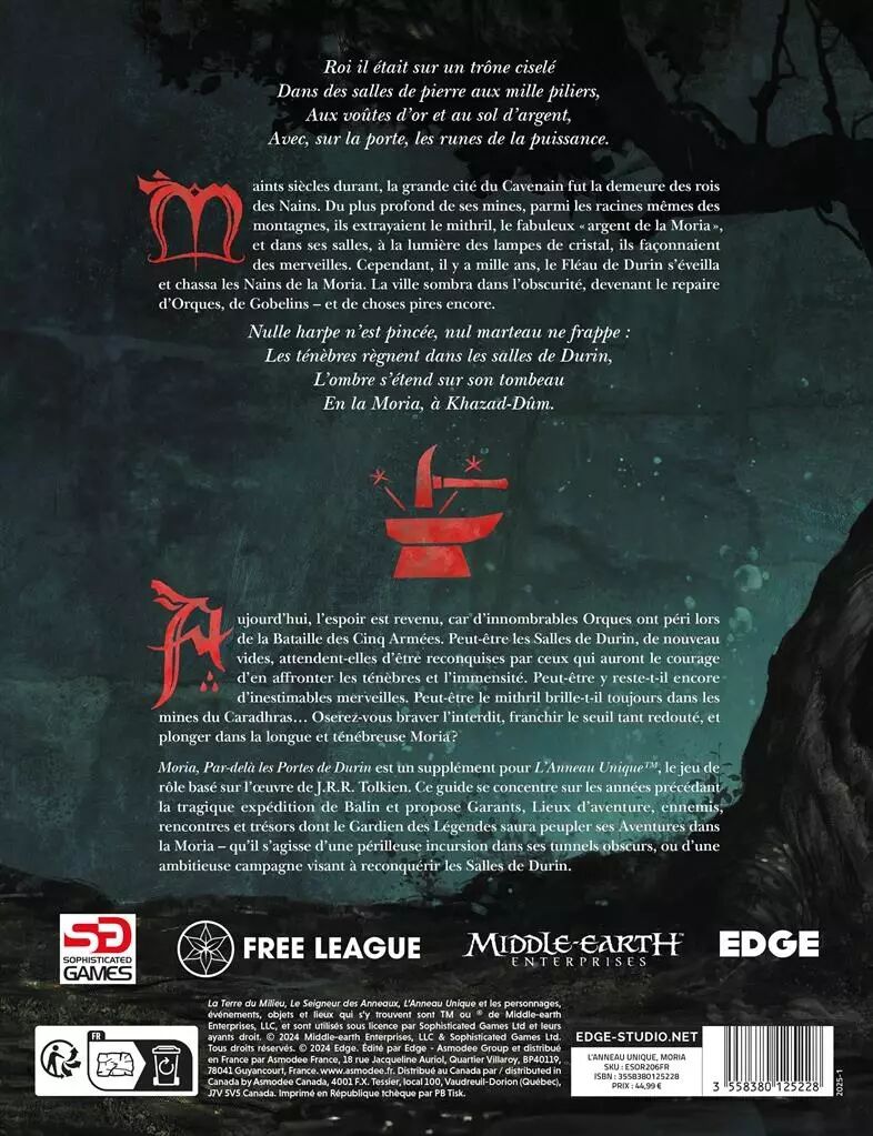 Moria, autrefois joyau de la civilisation naine, est aujourd’hui envahie par des forces obscures. Le livre invite les joueurs à franchir ce seuil périlleux, à explorer des galeries oubliées, combattre des ennemis et dénicher d’incroyables richesses, tout en vivant une atmosphère unique où le danger est omniprésent.