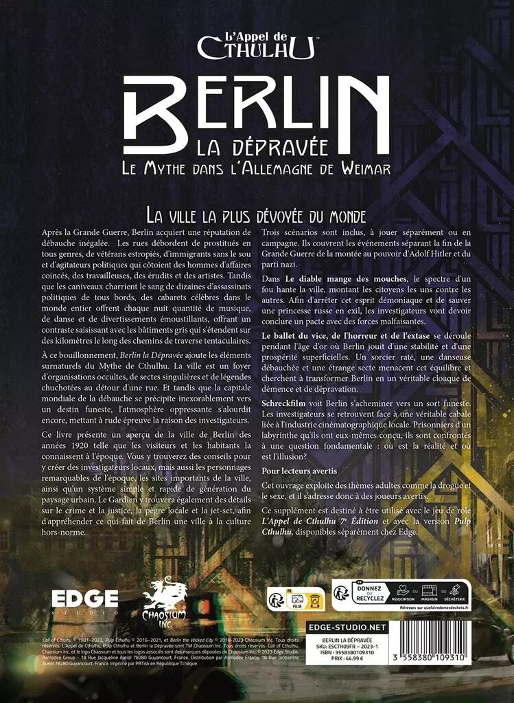 Et à ce bouillonnement, Berlin la Dépravée ajoute les éléments surnaturels du Mythe de Cthulhu. La ville est un foyer d’organisations occultes, de sectes singulières et de légendes chuchotées au détour d’une rue. Dans l’air malsain de la capitale mondiale de la débauche, la nature humaine est remise en question. Et tandis que Berlin se précipite inexorablement vers un destin funeste, l’atmosphère oppressante s’alourdit encore, mettant à rude épreuve la raison des investigateurs.