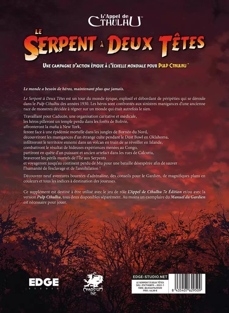 Le Serpent à Deux Têtes est une campagne épique et explosive, débordant de péripéties et se déroulant dans le Cthulhu Pulp des années 30. Les investigateurs se confrontent aux manigances sinistres d’une ancienne race de monstres décidée à régner sur un monde qui était autrefois le leur. Les héros, en travaillant pour Caducée, une ONG médicale, fouilleront un temple perdu dans les forêts de Bolivie, tiendront tête à la Mafia de New York, risqueront leur vie durant une épidémie mortelle dans les jungles de Bornéo, et exposeront au grand jour les plans d’un culte étrange dans le dust-bowl de l’Oklahoma. Ils devront aussi infiltrer le territoire de leurs ennemis au cœur d’un volcan grondant en Islande, être témoins d’abominables expérimentations médicales au Congo, jouer contre la montre pour s’emparer d’un objet magique ancien et puissant dans les rues de Calcutta, et, enfin, voyager jusqu’à un continent perdu pour y mener une bataille désespérée : sauver l’humanité de l’esclavage et de l’annihilation !