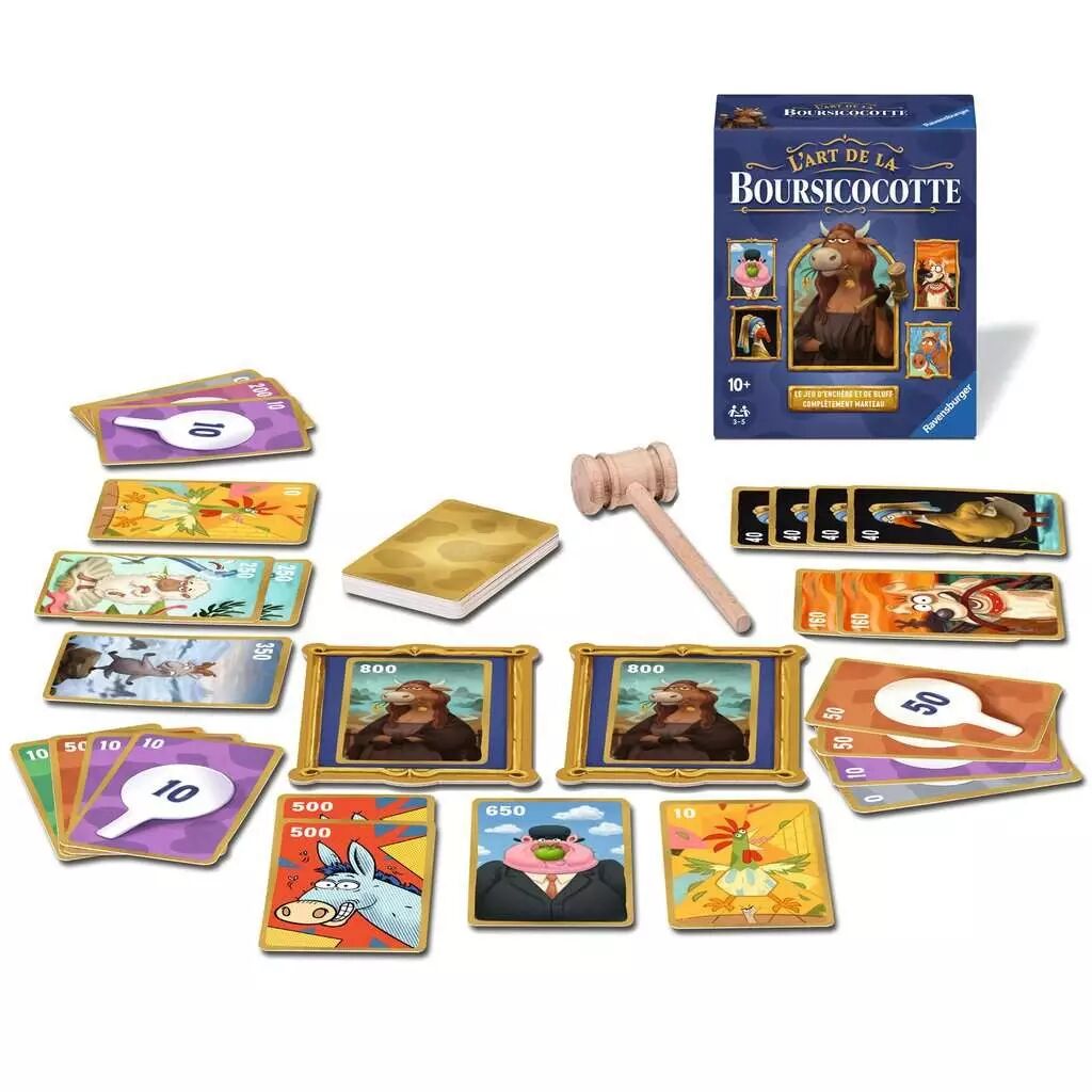 L’art de la Boursicocotte, c’est la crème du jeu d’enchères familial : chaque joueur tente de constituer des familles d’animaux-tableaux grâce à des ventes publiques hautes en couleur ou des tractations discrètes… et souvent rusées ! Le matériel séduit tout de suite : cartes animaux colorées, faux billets, cadres et un marteau en bois qui donne envie de lancer la partie “comme à la télé”. Une réussite pour mettre l’ambiance, où le bluff et la tchatche sont vite au rendez-vous.