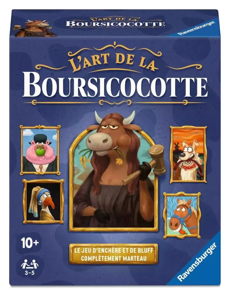 Emparez-vous du marteau en bois et enflammez les ventes aux enchères ! Pour l’occasion, les animaux prennent les traits de tableaux iconiques. Faites monter les enchères pour remporter un maximum d'argent ou utilisé votre droit de préemptions pour surprendre vos adversaires et remporter les animaux. Marchandez les animaux et proposez des offres cachées, mais attention, vos adversaires pourraient très bien faire les bonnes contre-offres… bluffantes… et tout rafler sous votre nez ! Cette ré-édition propose une revisite du grand classique Boursicocotte dans une version vachement plus rapide, simple et encore plus animée et amusant ! Vous avez également plein d'option pour jouer à la version originale ou pour diversifier vos parties. Un jeu parfait pour vos après-midi en famille ou entre amis.
