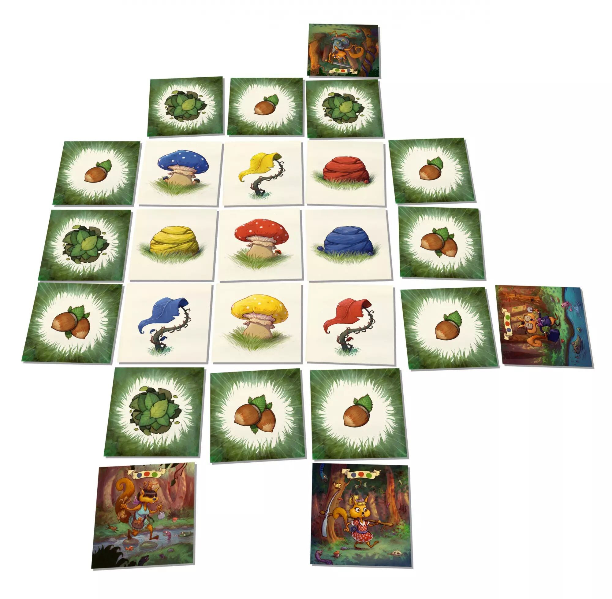 Au milieu, une forêt à traverser, ne contenant que 9 cartes sur lesquelles se trouvent 3 formes (champignon, feuille et caillou) de 3 couleurs différentes (rouge, bleu et jaune). Tout autour il y a les noisettes à retrouver. Chaque joueur pose sa carte Couadsou en face des noisettes qu'il souhaite gagner : il a donc 3 cartes Forêt à traverser. Pour cela, il doit trouver la forme ou la couleur au verso de chacune d'elles !