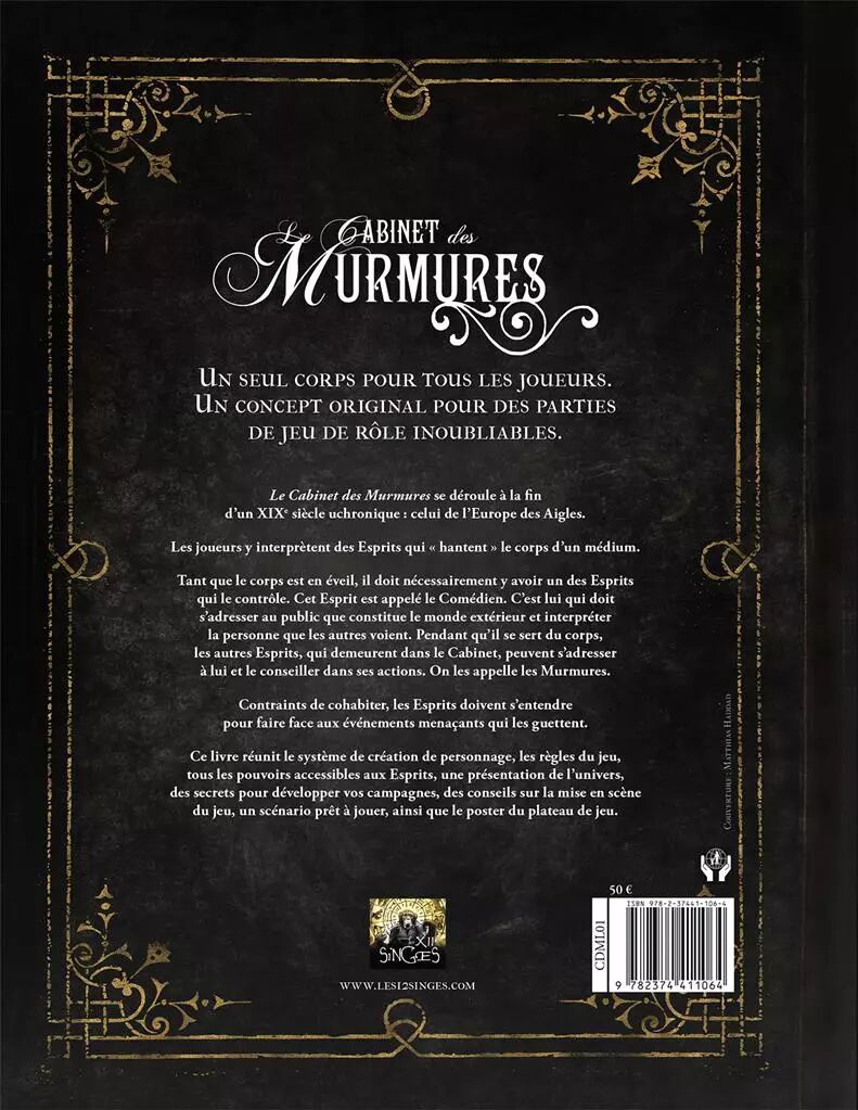 Réf. : RECDML01 Le Cabinet des Murmures est un jeu de rôle se déroulant à la fin d'un XIXe siècle uchronique : celui de l'Europe des Aigles. Les joueurs y interprètent des Esprits qui « hantent » le corps d'un médium.